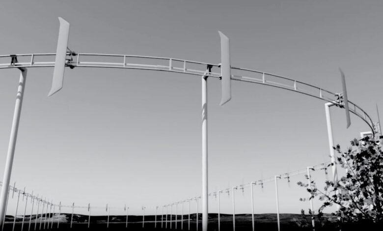 Most wind turbines look like space-age pinwheels, their blades sweeping a large circle. Airloom takes that classic turbine concept and deconstructs it. The startup swaps three long blades for an arbitrary number of much shorter ones, attaching them to a cable that runs along an oval track that can be as long or short as desired. The total height of the system is about 60 feet, far shorter than a typical wind turbine.