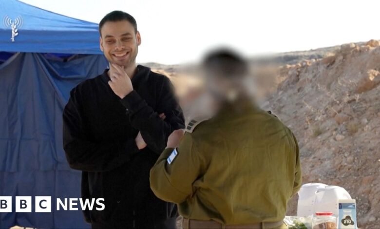 Israeli hostages Alon Ohel and Guy Gilboa-Dalal are seen speaking to IDF (Israel Defense Forces) soldiers after representatives of the Red Cross handed them over to Israel.