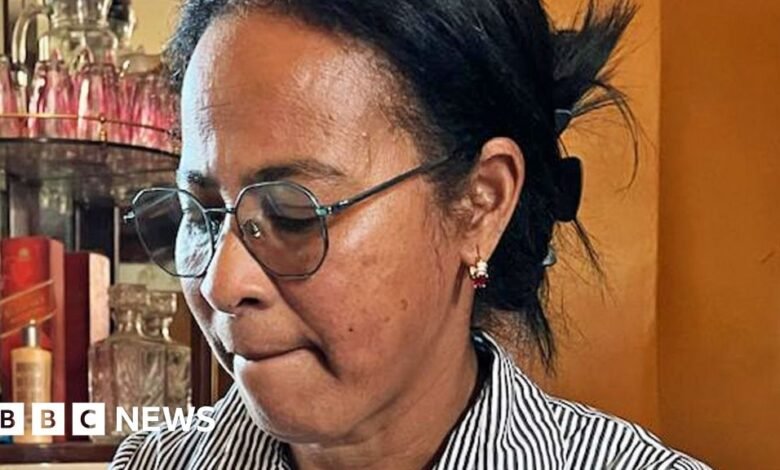 Sammy Awami / BBC Razanasoa Edmondine, sucking her lips, in a black and white stripy long-sleeved shirt looking at the last photos of her grandson at her home near Antananarivo.Sammy Awami / BBC