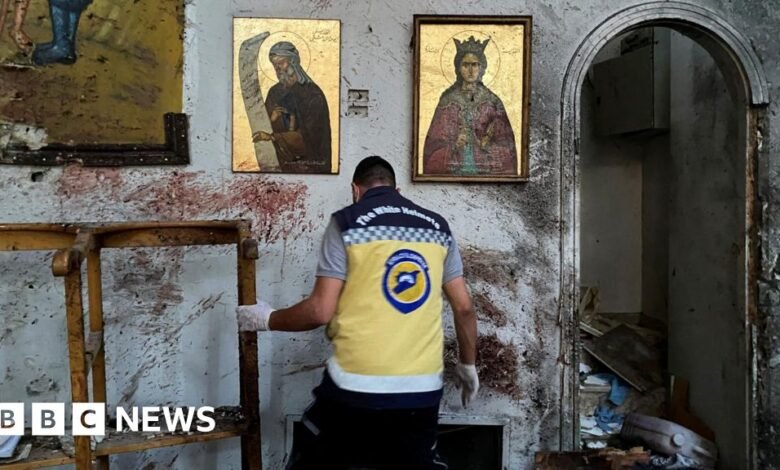 The Syrian Civil Defence – whose emergency teams are widely known as the White Helmets – posted photos and video from inside the church showing a heavily damaged altar, pews covered in broken glass and a bloodied floor.