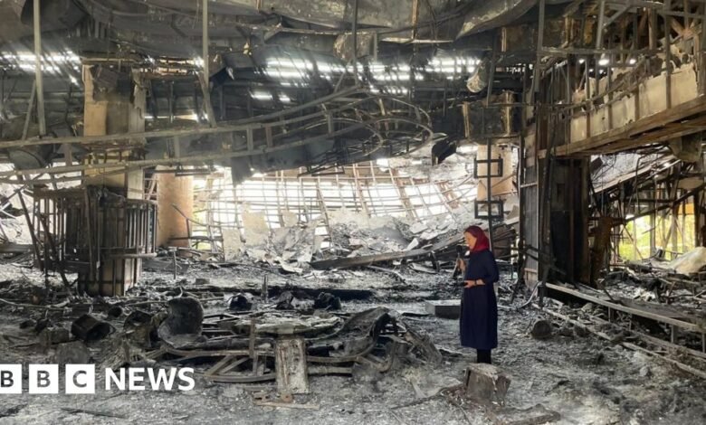 When an Israeli bomb slammed into this complex on 16 June, a raging fire swept through the main studio which would have aired the supreme leader’s address. Now it’s just ash.