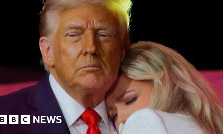 At the end of his address, in which he described Kirk as a “great of his generation”, Trump was joined on stage by Erika Kirk and the pair hugged as the crowd applauded.